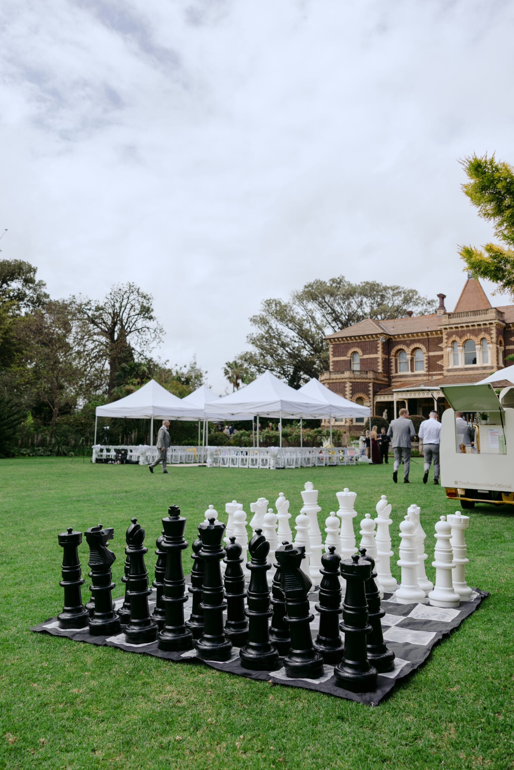 The perfect outdoor game for weddings, kids’ parties and social gatherings. Includes 16 black and 16 white chess pieces and one 3-metre x 3-metre playing mat. The largest piece measures 92cm in height.
