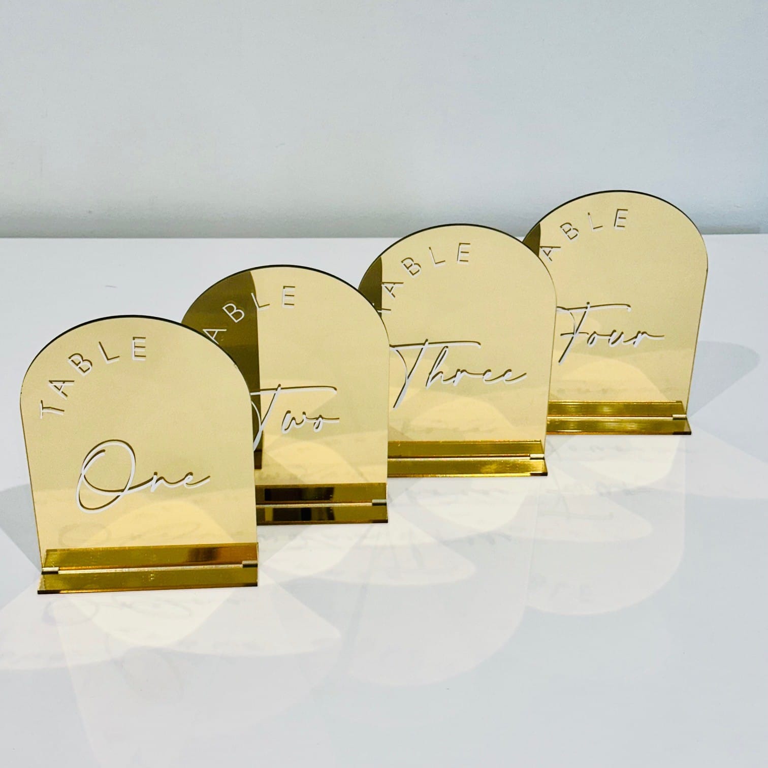 Gorgeous gold arched table numbers to compliment any event. Available from 1-4.