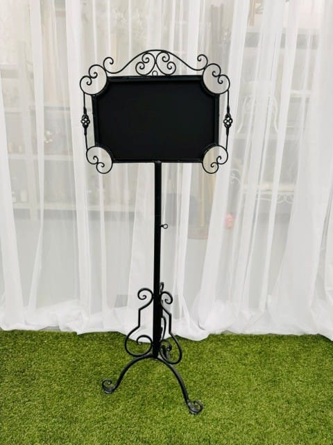 Add a touch of timeless elegance to your event with our Paris free standing chalkboard. Featuring a beautifully crafted metal frame with delicate scroll details and a classic blackboard centre. Perfect for weddings, engagements and all special celebrations.