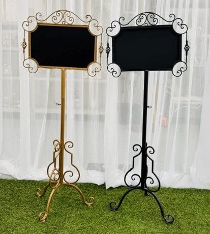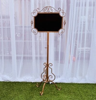 Add a touch of timeless elegance to your event with our Paris free standing chalkboard. Featuring a beautifully crafted metal frame with delicate scroll details and a classic blackboard centre. Perfect for weddings, engagements and all special celebrations.